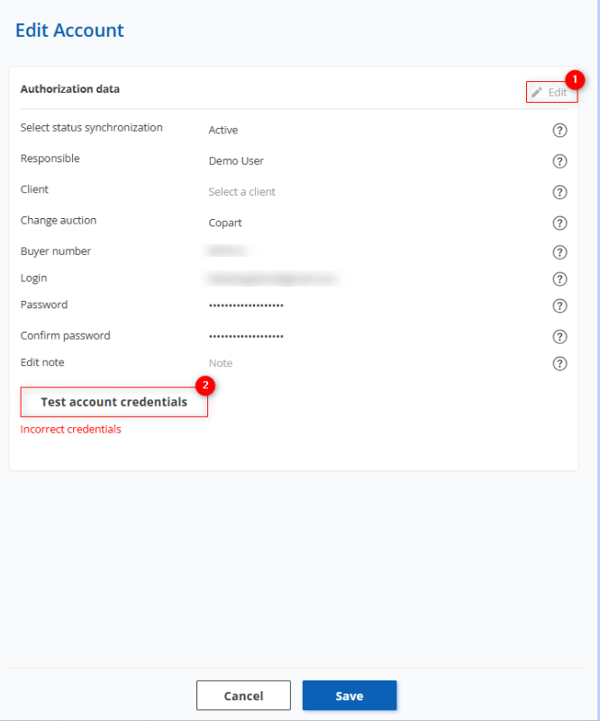 When you click this button, the system will check for the existence of the account on the corresponding auction. If the entered data is incorrect and the account is not found, a message will appear: “Incorrect credentials”.