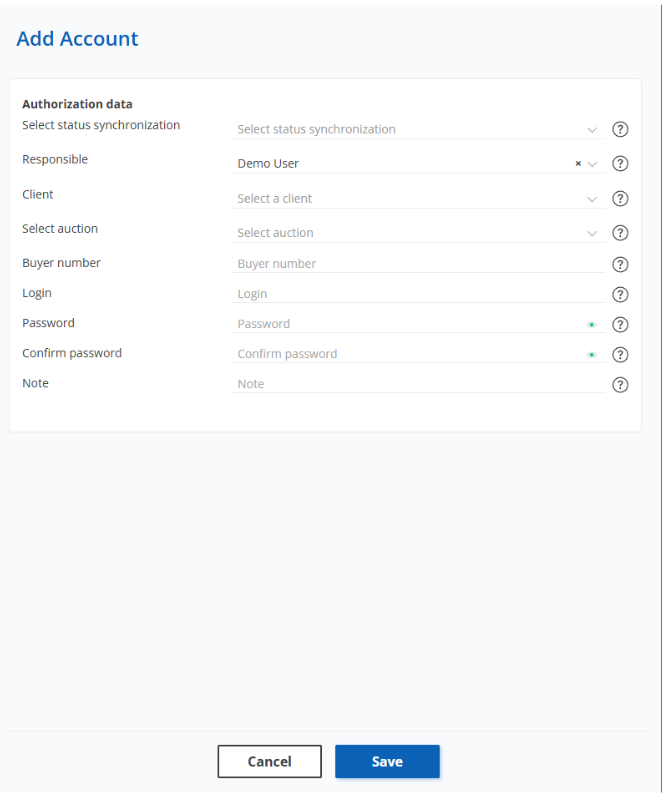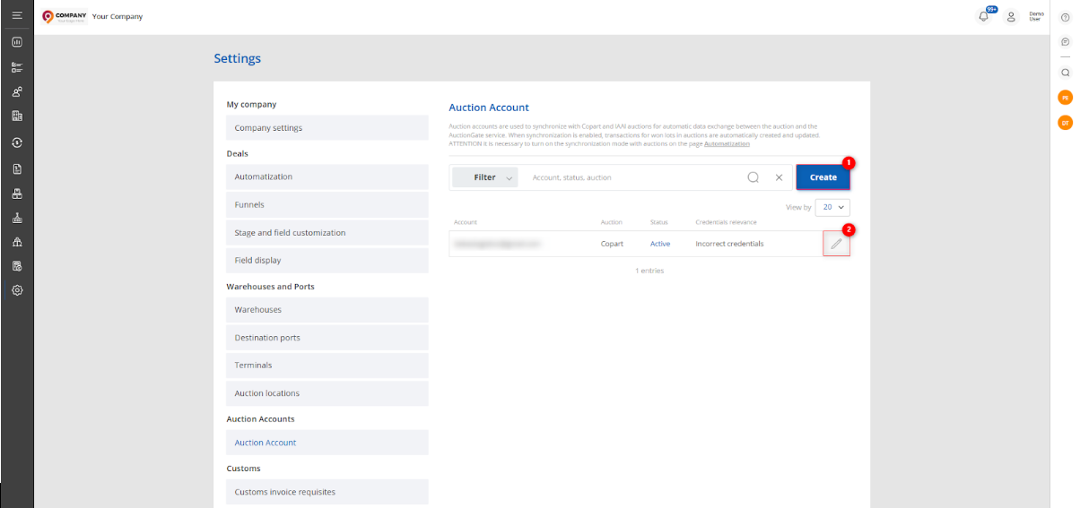 To create an integration with the auction, go to the “Settings” menu and open the “Auction account” section. After that, you will be redirected to the account management page where you can create, edit, or delete an auction account.