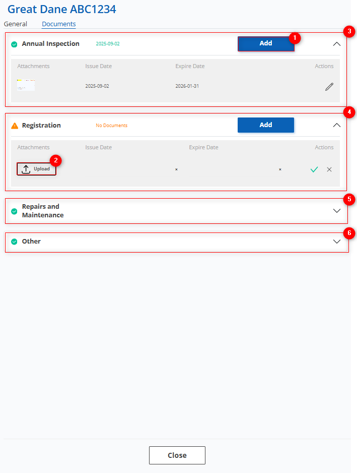 Note: Clicking the icon at the beginning of the row (Figure 1, Pointer 5) will show the status details for all of the trailer’s documents.