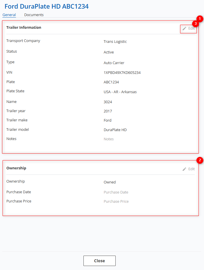 To make fields editable, click the "Edit" button (Figure 5, Pointer 3); after that you can make changes to the data in the same way as when they were initially created (see above). This section contains 2 blocks: “Trailer information” (Figure 5, Pointer 1) and “Ownership” (Figure 5, Pointer 2) — and has the same fields to fill in as when adding a new trailer.