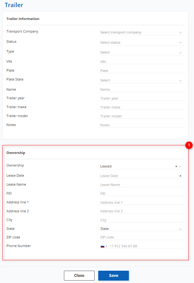 To make fields editable, click the "Edit" button (Figure 5, Pointer 3); after that you can make changes to the data in the same way as when they were initially created (see above). This section contains 2 blocks: “Trailer information” (Figure 5, Pointer 1) and “Ownership” (Figure 5, Pointer 2) — and has the same fields to fill in as when adding a new trailer.