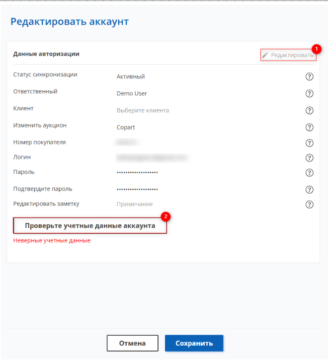 При нажатии на эту кнопку будет выполнена проверка наличия аккаунта на соответствующем аукционе. Если указанные данные некорректны и аккаунт не найден, появится сообщение: “Неверные учетные данные”.